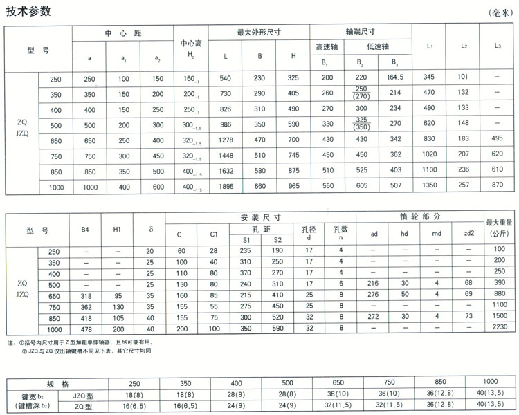 ZQ(JZQ),ZQH減速機(jī)型號(hào)有:250,350,400,500,650,750,850,1000,